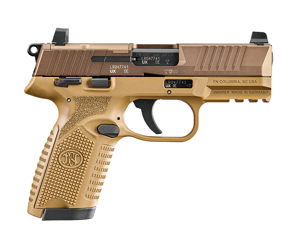FN 66101006 502 Tactical 22 LR 10+1/15+1, 4.60″ Black Steel Threaded Barrel, Flat Dark Earth Optic Ready/Serrated Slide & Polymer Frame w/Picatinny Rail, FDE Textured Polymer Grip, Ambidextrous